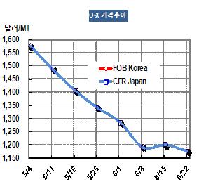 O-X(Ortho-Xylene) 가격이 6월22일 FOB Korea 1175달러로 톤당 25달러 하락했다. 중국 Sinopec은 “O-X의 내수가격이 더 떨어질 것으로 예상돼 6월 넷째 주에는 O-X 수입이 없을 것”이라고 밝혔다. 표, 그래프: < O-X 가격추이 > <화학저널 2012/06/28> |