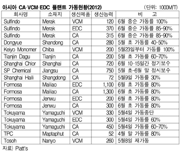 CA(Chlor-Alkali)는 이어지는 가동률 하락으로 수급이 타이트해질 것으로 예상된다. 한편, Keiyo Monomer는 Chiba 소재 VCM 20만톤 플랜트를 정상가동하고 있으며, Tosoh도 5월8일부터 Nanyo 소재 VCM 26만톤 플랜트를 정상가동하고 있는 것으로 알려졌다. <정현인 기자> 표, 그래프: < 아시아 CA·VCM·EDC 플랜트 가동현황(2012) > <화학저널 2012/06/28> |