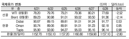 6월28일 91.77달러로 0.53달러 상승 … WTIㆍ브렌트유 2달러이상 폭락