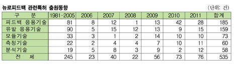 사람의 머리에서 발생하는 뇌파를 이용해 컴퓨터 등을 제어하는 뉴로피드백 관련기술 특허 출원이 증가하고 있다. 특허출원 증가는 뉴로피드백 기술 개발에 관련기업 및 연구소가 적극적으로 나서고 있기 때문으로, 미국의 NeuroSky가 MindWave 브랜드의 뉴로피드백 응용상품을 출시하는 등 다양한 응용기술에 대한 관심이 높아지고 있다. 표, 그래프: < 뉴로피드백 관련특허 출원동향 > <화학저널 2012/07/03> |
