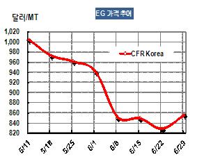 MEG 가격은 6월29일 CFR China 톤당 855달러로 27달러 상승했다. 그러나 MEG 가격 상승은 폴리에스터(Polyester) 시장의 약세로 다소 제한적일 것으로 예상된다. 표, 그래프: < EG 가격추이 > <화학저널 2012/07/03> |