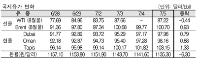 7월5일 국제유가는 노르웨이 북해유전 노동자의 파업 장기화에 따른 공급감소 우려 및 미국의 원유 재고 감소의 영향으로 상승했다. 7월5일 국제유가는 노르웨이 북해유전 노동자 파업이 장기화되면서 원유 공급부족이 우려돼 상승했다. 표, 그래프: < 국제유가 변화 > <화학저널 2012/07/06> |