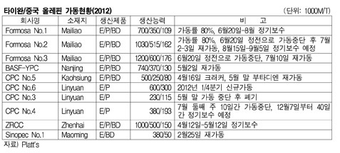 타이완 올레핀(Olefin) 시장의 수급타이트 심화가 우려된다. CPC도 Linyuan 소재 에틸렌 38만톤, 프로필렌 19만톤의 No.4 크래커를 7월 둘째주에 10일간 가동중단할 예정이다. 표, 그래프: < 타이완/중국 올레핀 가동현황(2012) > <화학저널 2012/07/06> |