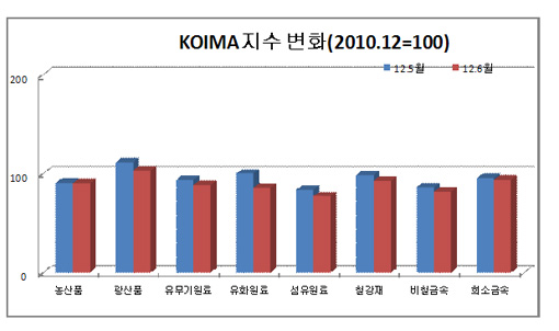 석유화학제품 수입가격이 6월에도 폭락했다. 표, 그래프: < KOIMA지수 변화(2010.12=100) > <화학저널 2012/07/11> |