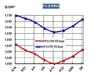 GPPS 가격은 7월4일 CFR FE Asia 톤당 1495달러로 45달러 폭등했다. 국제유가는 브렌트유(Brent) 기준 배럴당 98달러 후반으로 전주에 비해 4달러 이상 폭등했고, SM도 FOB Korea 톤당 1383달러로 95달러 폭등했다. 표, 그래프: < PS 가격추이 > <화학저널 2012/07/11> |