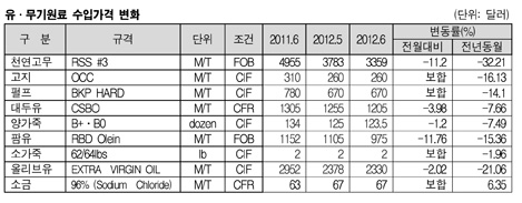 유기 및 무기원료 수입가격이 대폭 하락했다. 한편, 고지 및 펄프, 소금은 비수기 영향으로 거래가 부진해 보합세를 유지했고 소가죽 수입가격도 수요 부진이 지속되면서 보합세를 유지했다. <우연서 기자> 표, 그래프: < 유․무기원료 수입가격 변화 > <화학저널 2012/07/12> |