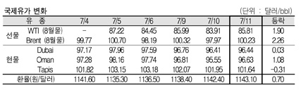 7월11일 국제유가는 북해산 및 이란산 원유 공급 감소 우려, 미국의 원유 재고 감소 발표 등으로 상승했다. 7월11일 국제유가는 노르웨이 석유근로자의 파업종료에도 불구하고 북해산 원유의 공급 감소 영향이 지속될 수 있다는 우려가 제기되면서 상승했다. 표, 그래프: < 국제유가 변화 > <화학저널 2012/07/12> |