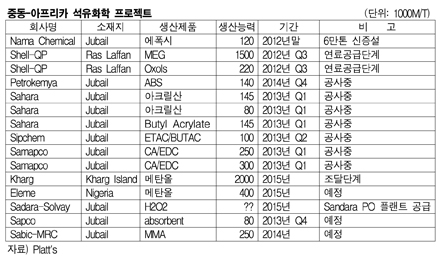 사우디의 Nama Chemical이 Al Jubail 소재 에폭시수지(Epoxy Resin) 12만톤 플랜트를 2012년 말까지 6만톤 증설한다. Shell-QP는 카타르 Doha의 북쪽에 위치한 Ras Laffan 공업도시에 MEG(Monoethylene Glycol) 150만톤 및 Oxo 22만톤 플랜트를 2016년까지 완공할 계획이다. 표, 그래프: < 중동-아프리카 석유화학 프로젝트 > <화학저널 2012/07/13> |