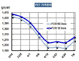 PET 가격은 7월4일 FOB NE Asia 톤당 1261달러로 52달러 급등했다. 원료 PTA(Purified Terephthalic Acid)는 CFR China 톤당 999달러로 70달러 폭등했고, MEG(Monoethylene Glycol)도 CFR China 톤당 894달러로 56달러 급등했다. 표, 그래프: < PET 가격추이 > <화학저널 2012/07/13> |