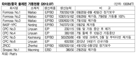 중국 및 타이완 올레핀(Olefin) 시장의 수급타이트가 다소 완화될 것으로 예상된다. 한편, 중국에서는 BASF-YPC가 Nanjing 소재 에틸렌 74만톤 및 프로필렌 37만톤 크래커와 부타디엔 13만톤 플랜트를 5월2일 재가동했다. <이민지 기자> 표, 그래프: < 타이완/중국 올레핀 가동현황 (2012.07) > <화학저널 2012/07/13> |