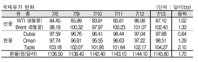 7월13일 국제유가는 중국의 경기둔화 우려 완화, 미국 증시의 상승, 이란 관련 국제적 긴장 지속으로 상승했다. 7월13일 국제유가는 중국의 2/4분기 경제성장률이 일부에서 우려한 만큼 나쁘지는 않은 것으로 나타난 것이 상승요인으로 작용했다. 표, 그래프: < 국제유가 변화 > <화학저널 2012/07/16> |