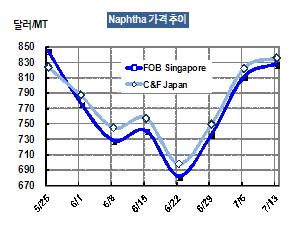 나프타 가격은 7월13일 CFR Japan Korea 톤당 836달러로 14달러 상승했다.
