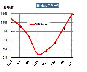 에틸렌 가격은 7월13일 FOB Korea 톤당 1060달러로 80달러 폭등했다.
