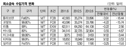 희소금속 수입가격이 대폭 하락했다. 마그네슘(Magnesium)은 중국ㆍ일본 등 주 소비국의 수요가 약세를 나타냈지만 가격은 FOB 톤당 3163달러로 보합세를 형성했고, 티타늄(Titanium)도 거래 부진으로 가격 변동 없이 1만8949달러를 유지했다. 표, 그래프: < 희소금속 수입가격 변화 > <화학저널 2012/07/16> |