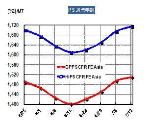 GPPS 가격은 7월11일 CFR FE Asia 톤당 1510달러로 15달러 상승했다. 일부 무역상과 유통상들이 국제유가 강세에 따라 8월 동북아시아 가격이 상승할 것으로 보고 오퍼를 계속했기 때문으로 판단된다. 표, 그래프: < PS 가격추이 > <화학저널 2012/07/18> |