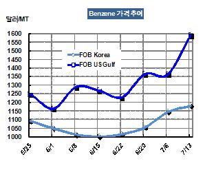벤젠 가격은 7월13일 FOB Korea 톤당 1181달러로 37달러 상승했다. 미국가격은 6월 1200달러대에서 6월 말 1300달러를 넘어선 후 7월13일 다시 1500달러를 동파하는 기록을 세웠다. 표, 그래프: < Benzene 가격추이 > <화학저널 2012/07/18> |