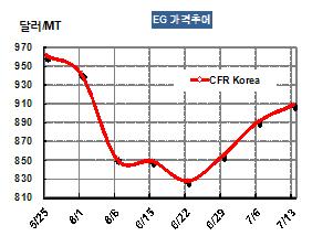 MEG 가격은 7월13일 CFR China 톤당 909달러로 18달러 상승했다. Saudi Kayan도 MEG 67만톤 플랜트를 8-9월 정기보수하기 위해 약 2개월간 가동을 중지할 계획이어서 아시아 MEG 시장의 수급타이트가 예상되고 있다. 표, 그래프: < EG 가격추이 > <화학저널 2012/07/19> |