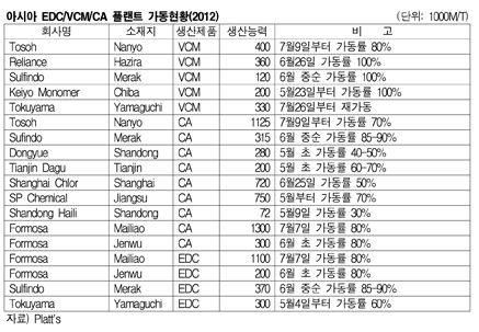 아시아 VCM(Vinyl Chloride Monomer) 수급타이트가 빠르게 완화되고 있다. Sulfino는 Merak 소재 EDC 37만톤 플랜트를 6월 중순부터 가동률 85-90%를 유지했으나 Tokuyama는 Yamaguchi 소재 EDC 30만톤 플랜트를 5월4일부터 60% 가동하고 있다. 표, 그래프: < 아시아 EDC/VCM/CA 플랜트 가동현황(2012) > <화학저널 2012/07/23> |