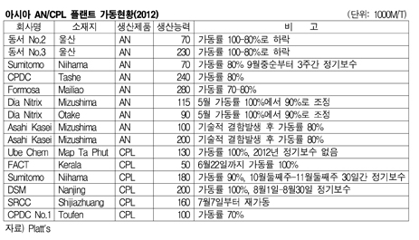 아시아 AN(Acrylonitrile) 공급과잉이 다소 완화되고 있다. 반면, 아시아 CPL(Caprolactam) 시장은 다시 공급과잉이 심화되고 있다. 표, 그래프: < 아시아 AN/CPL 플랜트 가동현황(2012) > <화학저널 2012/07/24> |