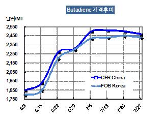 부타디엔 가격은 7월27일 FOB Korea 톤당 2430달러로 20달러 하락했다.