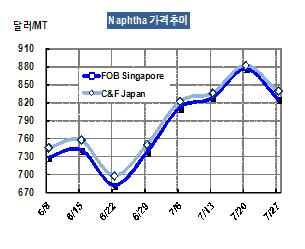 나프타 가격은 7월27일 CFR Japan 톤당 839달러로 43달러 폭락했다.