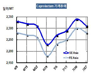 아시아 CPL 가격이 CFR FE Asia 톤당 2280달러로 20달러 하락했다. 중국 내수가격은 90일 신용거래 기준 ex-tank 톤당 1만8500위안으로 200위안 하락해 수입가격 기준 2287달러를 형성했다. 표, 그래프: < Caprolactam 가격추이 > <화학저널 2012/07/31> |