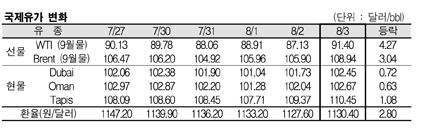 8월3일 WTIㆍ브렌트유 3-4달러 올라 … 두바이유도 102달러 유지