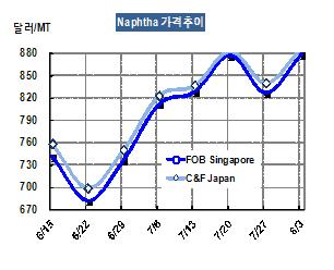 나프타 가격은 8월3일 CFR Japan 톤당 886달러로 47달러 폭등했다. 브렌트유는 7월 초 98달러대에 불과했으나 8월 초 110달러를 넘어섬으로써 한달만에 12달러 상승했다. 표, 그래프: < Naphtha 가격추이 > <화학저널 2012/08/06> |