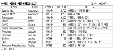 아시아 메탄올(Methanol) 가동률이 정상화 단계에 접어들고 있다. 반면, MTBE(Methyl tert-Butyl Ether)는 수급이 타이트해질 것으로 예상된다. 표, 그래프: < 아시아 메탄올 가동현황(2012.07) > <화학저널 2012/08/07> |