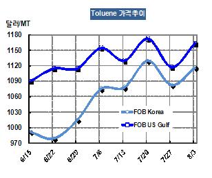 톨루엔 가격은 8월3일 FOB Korea 톤당 1117달러로 35달러 상승했다. 미국의 톨루엔 현물가격은 FOB US Gulf 갤런당 383센트로 톤당 1163달러를 형성해 45달러 급등했다. 표, 그래프: < Toluene 가격추이 > <화학저널 2012/08/07> |