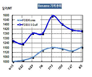 벤젠 가격은 8월3일 FOB Korea 톤당 1187달러로 51달러 급등했다. 미국의 10월 공급물량은 FOB US Gulf 갤런당 402센트로 8센트 올라 톤당 1203달러를 형성했으나, 현물가격은 갤런당 465센트로 톤당 1395달러를 나타내 15달러 하락했다. 표, 그래프: < Benzene 가격추이 > <화학저널 2012/08/08> |