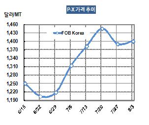 아시아 P-X(Paraxylene) 가격이 8월3일 FOB Korea 톤당 1400.50달러로 15달러 상승했다. 8월 ACP(아시아 계약가격) 협상이 원인으로 8월1일 CFR 1365달러로 결정됐으나 협상결과가 나오기 전까지 혼란을 겪었다. 표, 그래프: < P-X 가격추이 > <화학저널 2012/08/09> |