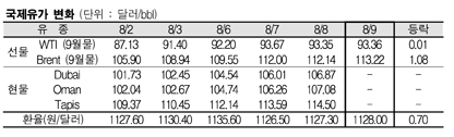 8월9일 국제유가는 미국의 경기지표 개선 소식의 영향 등으로 상승했다. 8월9일 국제유가는 미국의 경기지표 개선 소식의 영향으로 상승했다. 표, 그래프: < 국제유가 변화 > <화학저널 2012/08/10> |