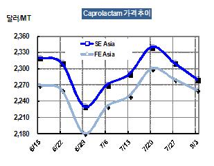 아시아 CPL 가격은 CFR FE Asia 톤당 2260달러로 20달러 하락했다. 중국 내수가격은 90일 신용거래 기준 ex-tank 톤당 1만8300위안으로 200위안 하락해 수입가격 기준 2267달러를 형성했다. 표, 그래프: < Caprolactam 가격추이 > <화학저널 2012/08/10> |