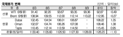 8월10일 108.22달러로 1.35달러 상승 … WTIㆍ브렌트유는 하락