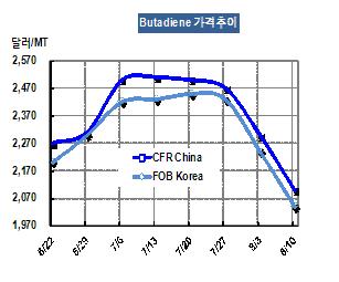 부타디엔 가격은 8월10일 FOB Korea 톤당 2039달러로 200달러 폭락했다. 말레이의 Titan Chemical이 9월 16-30일 사이에 2000톤을 현물 공급한 것도 약간 영향을 미쳤다. 표, 그래프: < Butadiene 가격추이 > <화학저널 2012/08/13> |