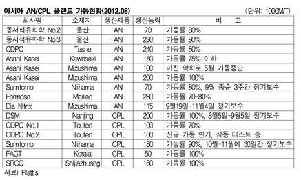 아시아 AN(Acrylonitrile) 시장이 지속되는 공급부족과 정기보수로 수급타이트가 심화될 것으로 예상된다. 아시아 CPL(Caprolactam 시장도 잇따른 가을 정기보수에 따라 공급부족 현상이 심화될 것으로 우려되고 있다. 표, 그래프: < 아시아 AN/CPL 플랜트 가동현황(2012.08) > <화학저널 2012/08/14> |