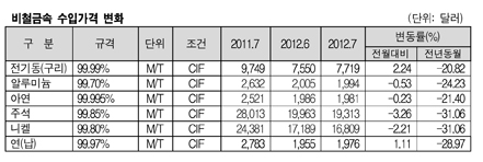 비철금속 수입가격이 하락세를 지속했다. 비철금속 수입가격은 글로벌경기 침체에 따른 수요 감소로 가격이 하락세를 지속하고 있지만 하락폭은 줄어들고 있다. 표, 그래프: < 비철금속 수입가격 변화 > <화학저널 2012/08/14> |