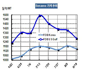 벤젠 가격은 8월10일 FOB Korea 톤당 1149달러로 38달러 하락했다. 한국산의 미국 수출도 9월 초 공급물량 3만9000톤을 선적한 것을 끝으로 당분간 미국수출이 막힌 것으로 알려졌다. 표, 그래프: < Benzene 가격추이 > <화학저널 2012/08/16> |