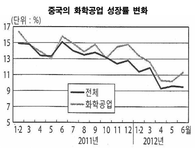 중국경제 성장이 둔화되면서 화학기업의 수익이 눈에 띄게 감소하고 있다. 표, 그래프: < 중국의 화학공업 성장률 변화 > <화학저널 2012/08/20> |