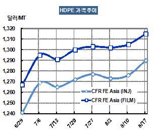HDPE 가격은 8월15일 CFR FE Asia 톤당 1291달러로 14달러 상승했다. 중국을 중심으로 플래스틱 가공기업들이 재고가 낮은 수준을 유지함으로써 구매수요가 발생했기 때문으로 판단된다. 표, 그래프: < HDPE 가격추이 > <화학저널 2012/08/21> |