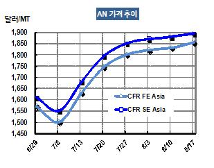 AN 가격이 8월14일 CFR FE Asia 톤당 1855달러로 25달러 상승했다. 8월 Cargo 가격은 9-10월 수급타이트가 심화될 것으로 보고 CFR China 톤당 1900달러를 형성하며 50달러 상승했다. 표, 그래프: < AN 가격추이 > <화학저널 2012/08/23> |