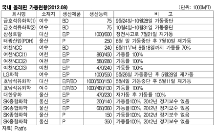 국내 올레핀(Olefin) 크래커가 가동률 100%를 지속하고 있어 공급과잉이 우려된다. 삼성토탈은 대산 소재 에틸렌 100만톤, 프로필렌 60만톤 크래커를 정전사고 후 7월21일부터 재가동해 현재 풀가동하고 있는 것으로 알려졌으며, 대한유화도 울산 소재 에틸렌 47만톤 및 프로필렌 23만톤 크래커를 100% 가동하고 있다. 표, 그래프: < 국내 올레핀 가동현황(2012.08) > <화학저널 2012/08/24> |