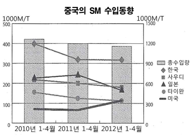 셰일가스(Shale Gas) 혁명이 아시아 SM(Styrene Monomer) 시장을 크게 변화시키고 있다. 표, 그래프: < 중국의 SM 수입동향 > <화학저널 2012/08/27> |
