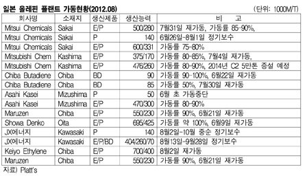 일본 올레핀(Olefin) 시장은 하반기에도 낮은 가동률과 정기보수가 이어져 수급타이트가 심화될 것으로 우려된다. Chiba Butadiene 역시 Chiba 소재 부타디엔(Butadiene) 8만5000톤 플랜트를 7월30일 재가동한 후 가동률을 무려 50%까지 감축했다. 표, 그래프: < 일본 올레핀 플랜트 가동현황(2012.08) > <화학저널 2012/08/28> |