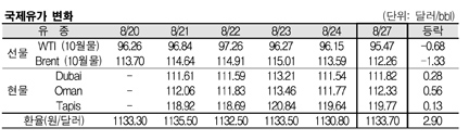 8월27일 국제유가는 국제에너지기구(IEA)의 비축유 방출 전망 지속, 열대폭풍 이삭(Isaac) 세력 약화 전망으로 하락했다. 8월27일 국제유가는 IEA가 전략비축유(SPR) 방출을 검토할 것이라는 전망이 지속되면서 하락했다. 표, 그래프: < 국제유가 변화 > <화학저널 2012/08/28> |