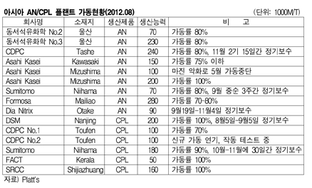 아시아 AN(Acrylonitrile) 시장이 낮은 가동률과 하반기 정기보수가 잇따라 수급타이트가 우려되고 있다. 한편, 아시아 CPL(Caprolactam) 시장도 정기보수와 낮은 가동률로 공급부족 현상이 심화될 것으로 예상된다. 표, 그래프: < 아시아 AN/CPL 플랜트 가동현황(2012.08) > <화학저널 2012/09/10> |