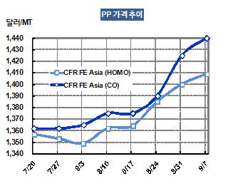 아시아 PP 가격은 9월5일 CFR FE Asia 톤당 1409달러로 9달러 상승했다. 중동산 가격은 CFR China 톤당 1400-1410달러를 형성했고, 한국산은 CFR China 톤당 1450달러를 기록했다. 표, 그래프: < PP 가격추이 > <화학저널 2012/09/11> |