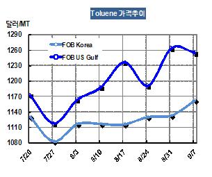 톨루엔 가격은 9월7일 FOB Korea 톤당 1163달러로 30달러 상승했다.