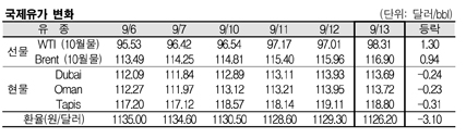 9월13일 국제유가는 미국 연방준비제도 3차 양적완화 실시, 중동지역 긴장 고조 등으로 상승했다. 9월13일 국제유가는 미국 연방준비제도가 3차 양적완화를 실시할 것이라고 발표한 영향으로 상승했다. 표, 그래프: < 국제유가 변화 > <화학저널 2012/09/14> |